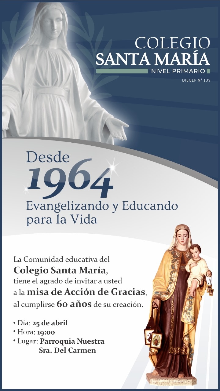 Este jueves 25 de abril a las 19 hs. se realizará una misa de acción de gracias en la Iglesia Nuestra Señora Del Carmen, en el marco del 60 aniversario del Colegio primario Santa María.