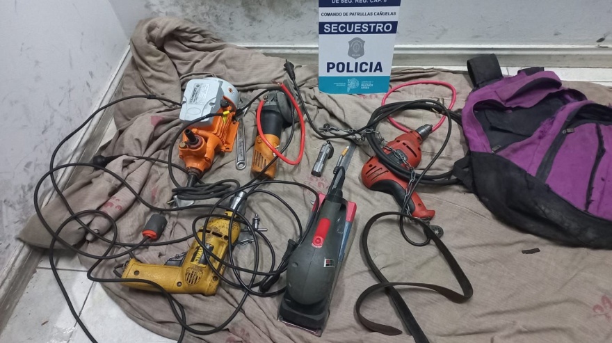 Personal del Comando de Patrullas a cargo de R. Francavila, detectó los movimientos del sospechoso y lo interceptaron en la intersección de calles San Martín y Azcuénaga. Entre las pertenencias había una mochila negra con detalles violetas que tenía en su interior: 2 taladros eléctricos (uno marca “Black & Decker” y otro marca “Dewal”); 1 amoladora marca “Lusqtof”; 1 lijadora eléctrica marca “Skil”; 1 llave tipo francesa; 1 bomba centrifuga color naranja marca “Lusqtoff”; 1 escalímetro metálico digital marca Stainless Hardened; 1 linterna metálica marca “Silvania”.