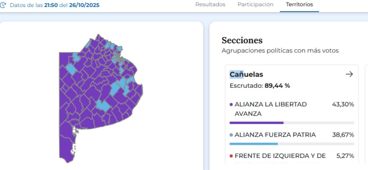 Cómo votaron los Cañuelenses?: En nuestra ciudad, Cañuelas con el 89.44% de las mesas escrutadas, LLA obtuvo el 43.30% con 13.785 votos; seguido por Fuerza Patria con el 38,67% de los votos, esto representa el porcentaje de 12.310 votos. La tercera fuerza fue la Izquierda con el 5.27%, esto equivale a 1.680 votos.