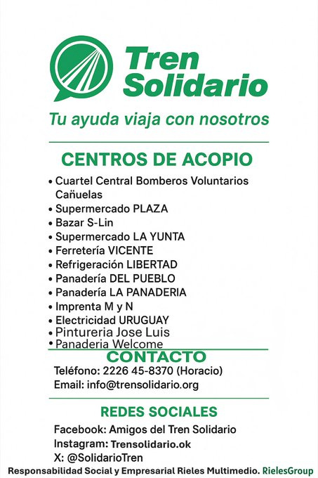 En esta oportunidad se están necesitando donaciones de bolsas de cemento; rollos de alambre; clavos para reparación de techos; herramientas; machimbres; alimentos no perecederos; agua mineral; elementos de limpieza; y lavandina.
