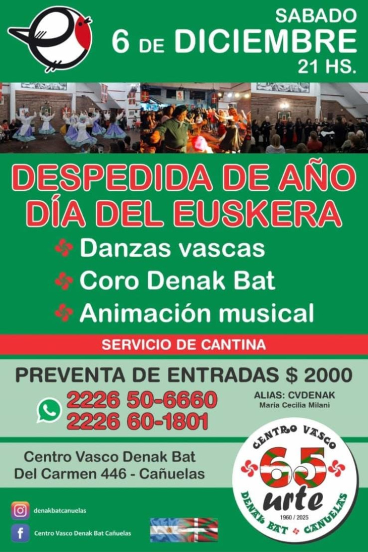 El sábado 6 de diciembre a las 21 horas, se realizará la despedida de año del Centro Vasco Denak Bat de Cañuelas.