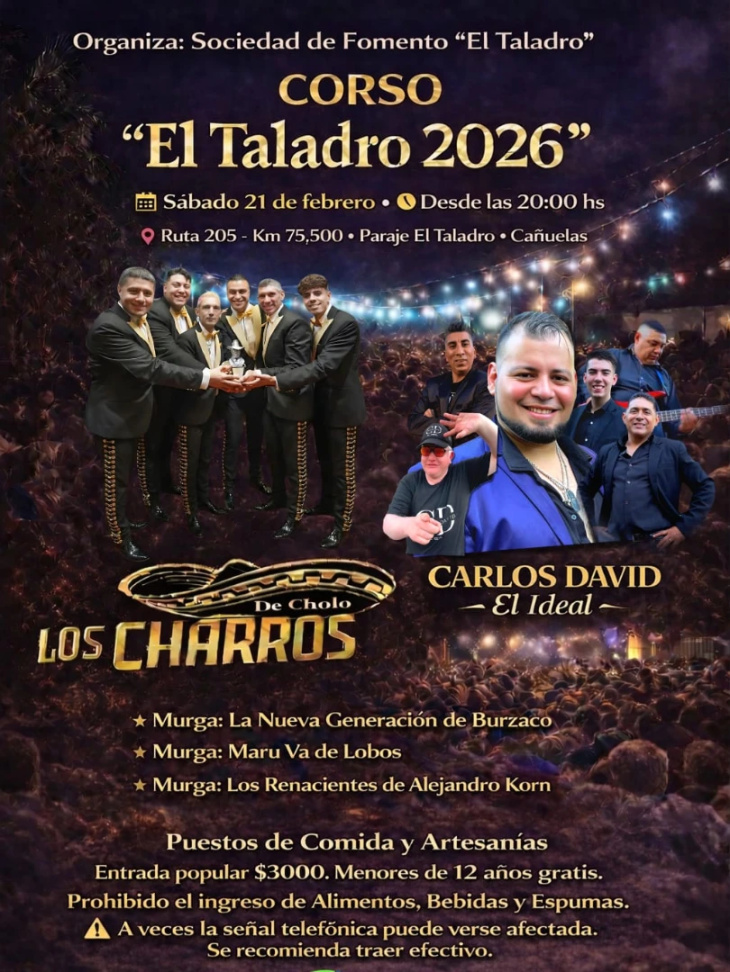 Organizado por la Sociedad de Fomento “El Taladro”, será una noche de fiesta, música y baile con la presentación de Los Charros.