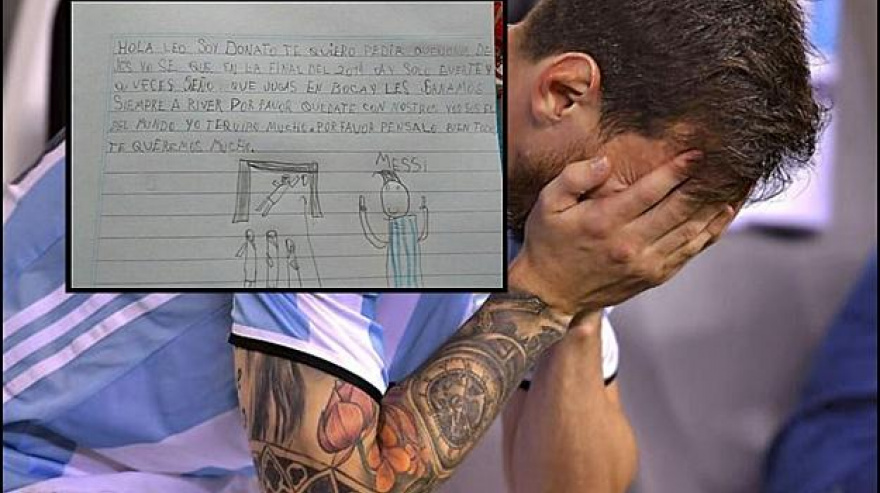 El niño, como millones de personas en el mundo, le pide al mejor jugador del mundo "...por favor, quédate con nosotros...Yo te quiero mucho". Y por si tomó la decisión de forma apresurada, Donato le sugiere, "...Por favor pensalo bien. Todos te queremos mucho".