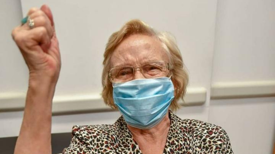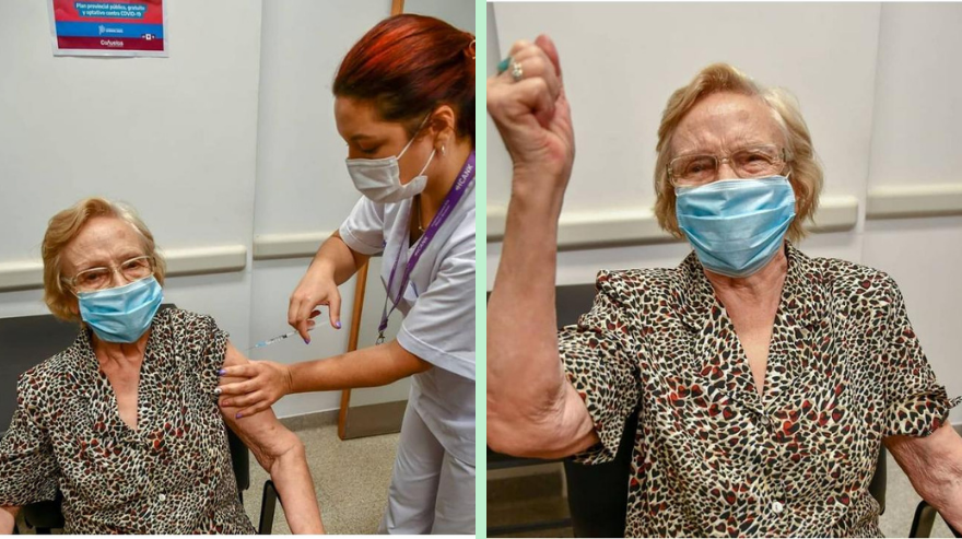 La mujer que recibió con alegría la dosis de la vacuna contra el COVID tiene 90 años.